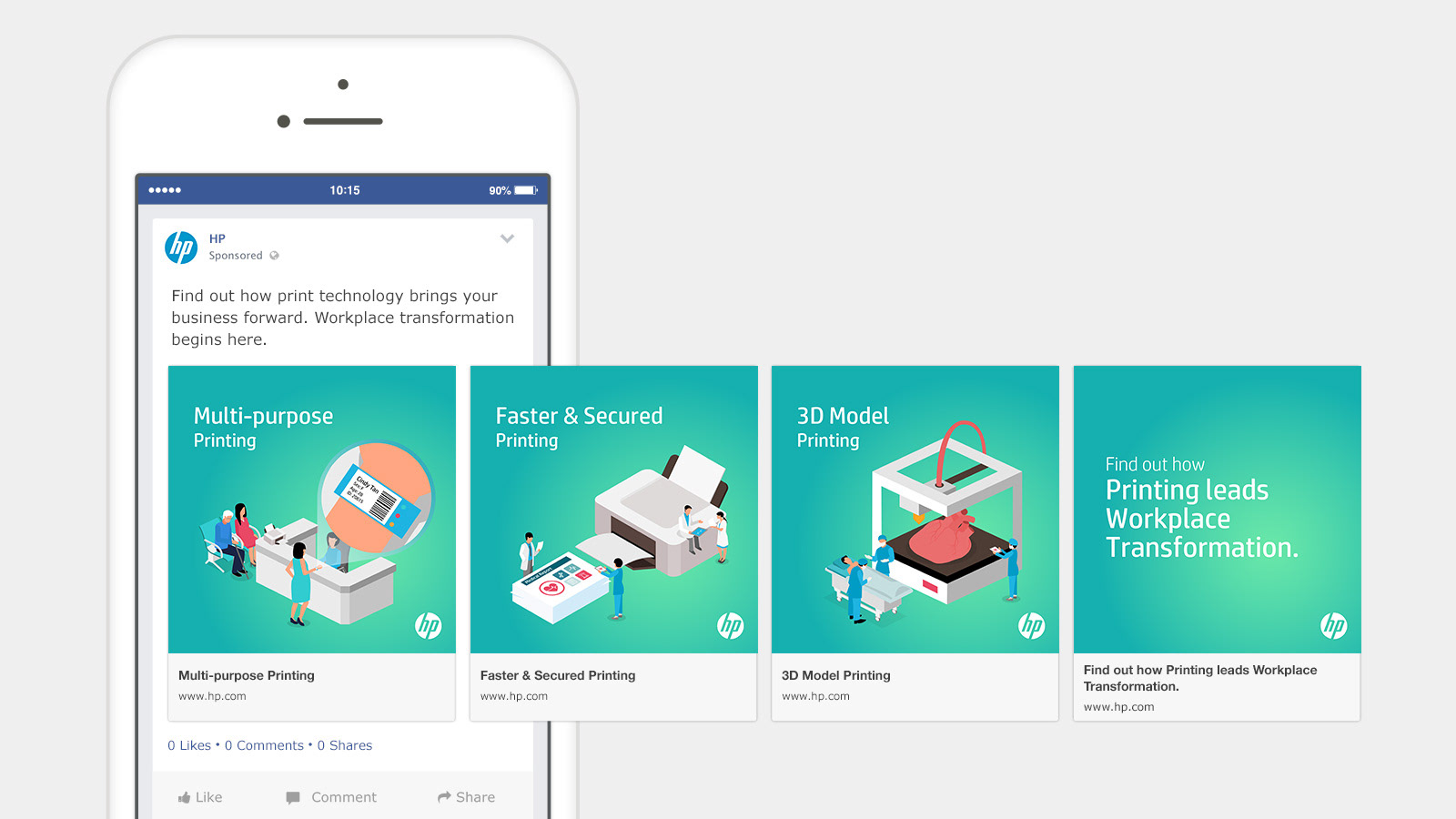 This was a project for HP A3 PageWide printers. The brief was to refresh the digital and social assets within the A3 PageWide content toolkit. The proposed art direction was using isometric colourful illustration to demonstrate sustainable colour printing across healthcare.